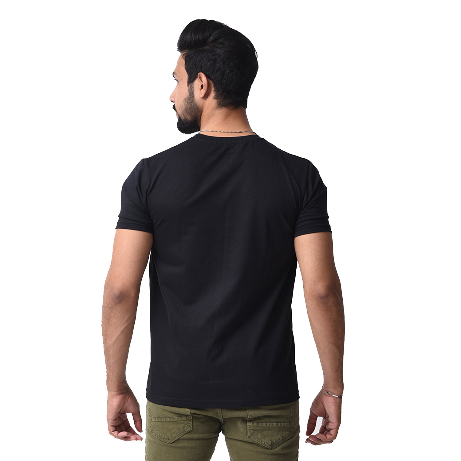 Black printed T-shirt, has a round neck, short sleeves