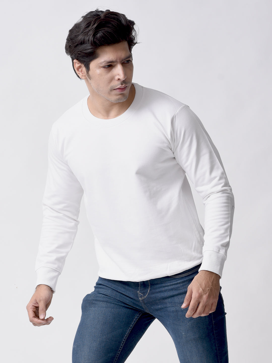 White solid sweatshirt, both side pocket, long sleeves, straight hem.