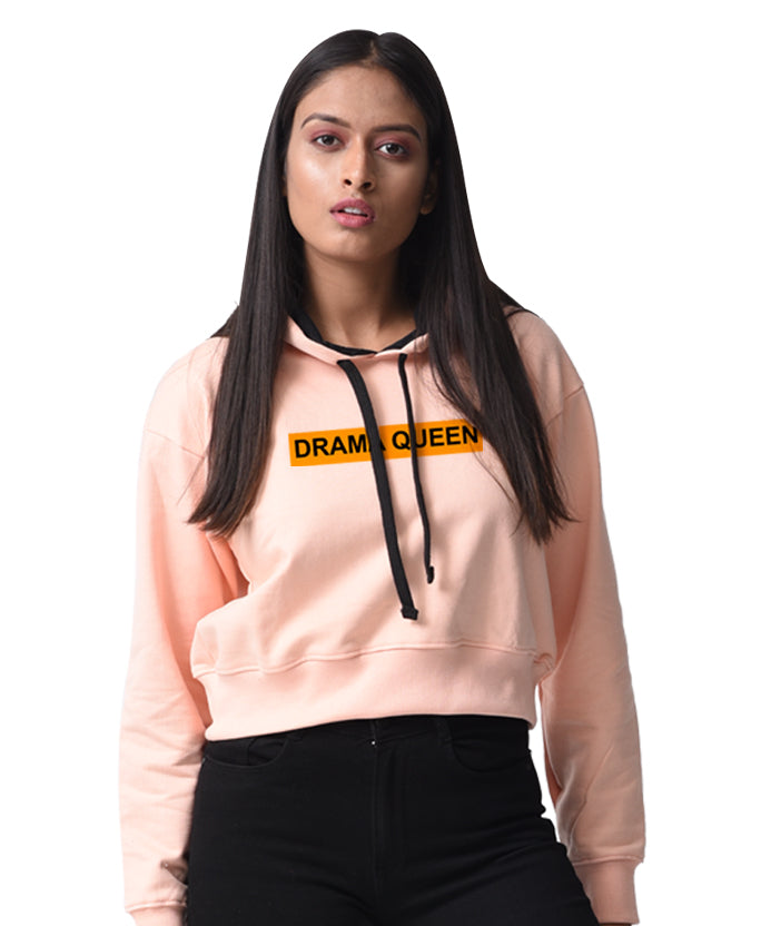 Peach crop hoodie, has a hood, long sleeves, straight hem.