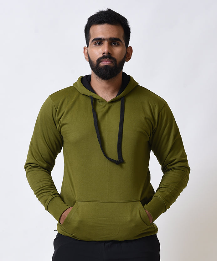 Olive Hoodie, has a hood, both side pocket, long sleeves, straight hem.