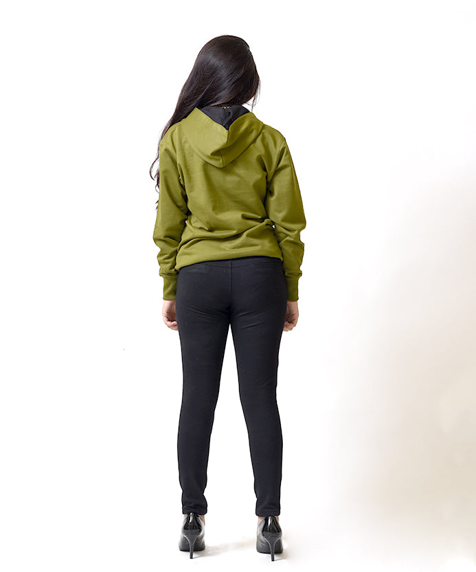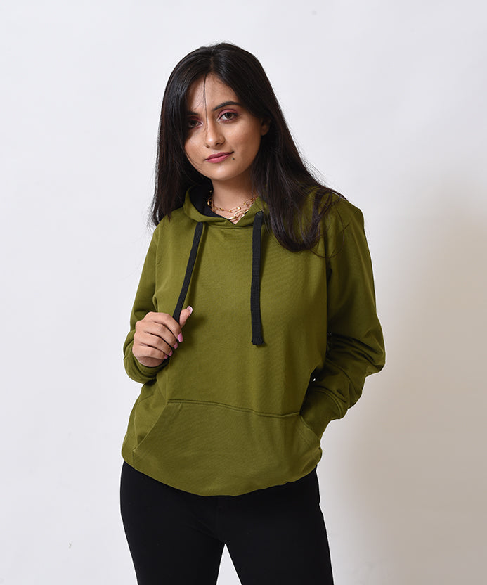 Olive Hoodie, has a hood, both side pocket, long sleeves, straight hem.