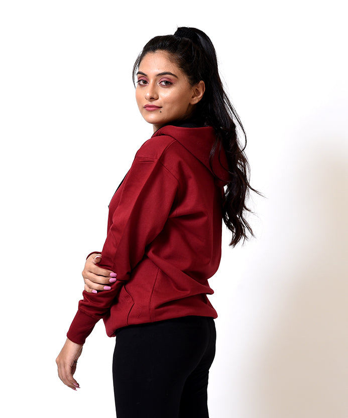 Maroon Hoodie, has a hood, both side pocket, long sleeves, straight hem.