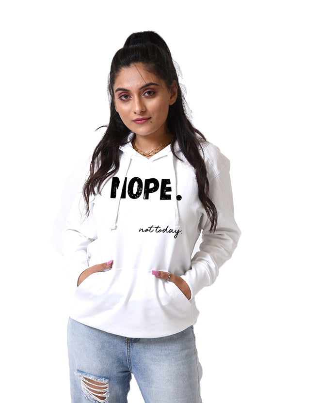 White hoodie, has a hood, both side pocket, long sleeves, straight hem.